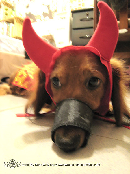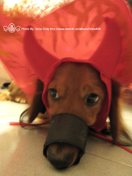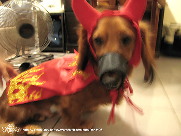 話說萬聖節那天,小吉利的乾媽之ㄧ---小容容前一個禮拜告訴我他有買禮物給吉利,是萬聖節可以穿的衣服,本來我還想該不會是南瓜裝或吸血鬼之類的,那天小容容帶來送給吉利的時候,我跟她簡直笑翻了,我們倆很開心的想幫吉利穿上牠的禮物,可是吉利似乎不怎麼領情,一直掙扎,不然就是把頭上的小惡魔角給甩飛出去,任憑我們兩手忙腳亂的,牠老爺就是不肯就範,所以我只好出絕招--又再度把他嘴巴套上,結果牠就變的超級DOWN....也放棄掙扎了,我跟小容容迅速的幫牠著裝。