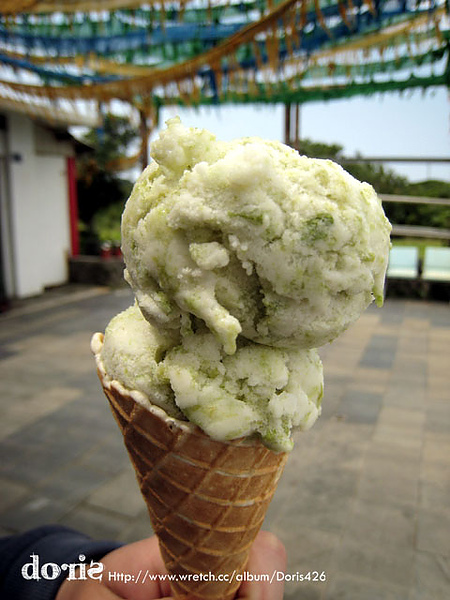 浮潛玩回民宿整理打包,我們就離開民宿了,沿路再到昨天沒去的一些景點逛逛,經過觀音廟外突然想到前一天晚上老闆有說這裡的名產是芡粿,就只有在觀音廟外有販售,所以我們就停下來順便吃個午餐,叫了一份芡粿+海草冰淇淋,我只能說,都是海草味呀~~
