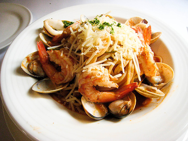 流氓點【辣味番茄海鮮義大利麵】但不加辣 (所以何不講海鮮義大利麵就好?)也是大大顆的蛤利跟蝦子
