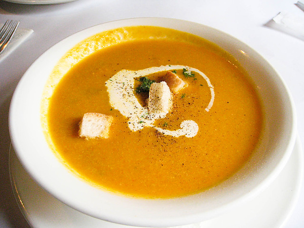 因為加99元可以享受到飲料、甜點、濃湯3選2,所以我們大家都加點了99元送完現烤麵包後,接著下來就是這道超濃南瓜濃湯~好好喝喔!!!