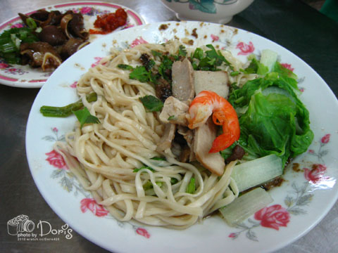 我又點了一碗乾意麵,味道也很棒,吃起來份量剛好,也毫不馬虎的加了肉片.青菜.肉燥.還有一隻剝好的蝦子,真有擔仔麵的FU~這碗乾意麵只要NT.40,價格很合理喔!!