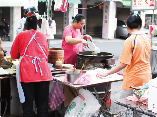 現場有三位女性分工合作,一位招呼客人,一位桿麵糰跟包韭菜盒,一位負責煎點心,和客人沒什麼距離會說說笑笑的很親切,我在拍照時隔壁賣臭豆腐的客人還慫恿老闆叫我幫他拍個幾張,可惜我吃完一籠蒸餃跟蔥油餅就飽了,沒辦法品嘗到他們的臭豆腐真不好意思捏~~下次再去吃嚕。