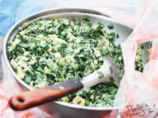 新鮮的韭菜盒子餡料,現包現做,這個我還沒吃過,因為我這挑食的小孩不喜歡吃韭菜